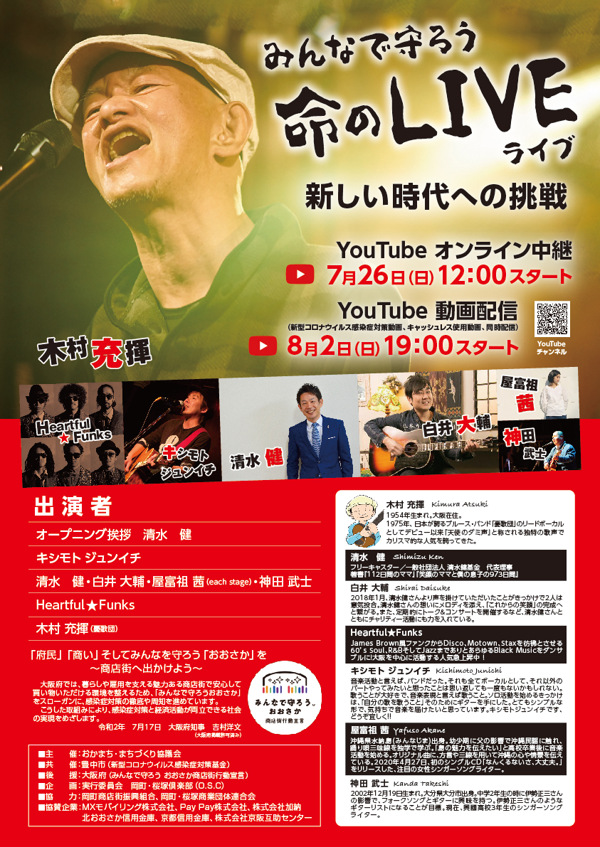 投稿日 2020.07.25 (Sat)2020/7/26(Sun) 2020/7/26(Sun) ●配信ライブです ・みんなで守ろう命のLIVE ・7月26日(日)12:00 配信スタート ・視聴無料 ・出演者 木村 充揮 Heartful★Funks 清水 健 白井 大輔 屋富祖 茜 神田 武士 キシモト ジュンイチ ・視聴はこちらから
