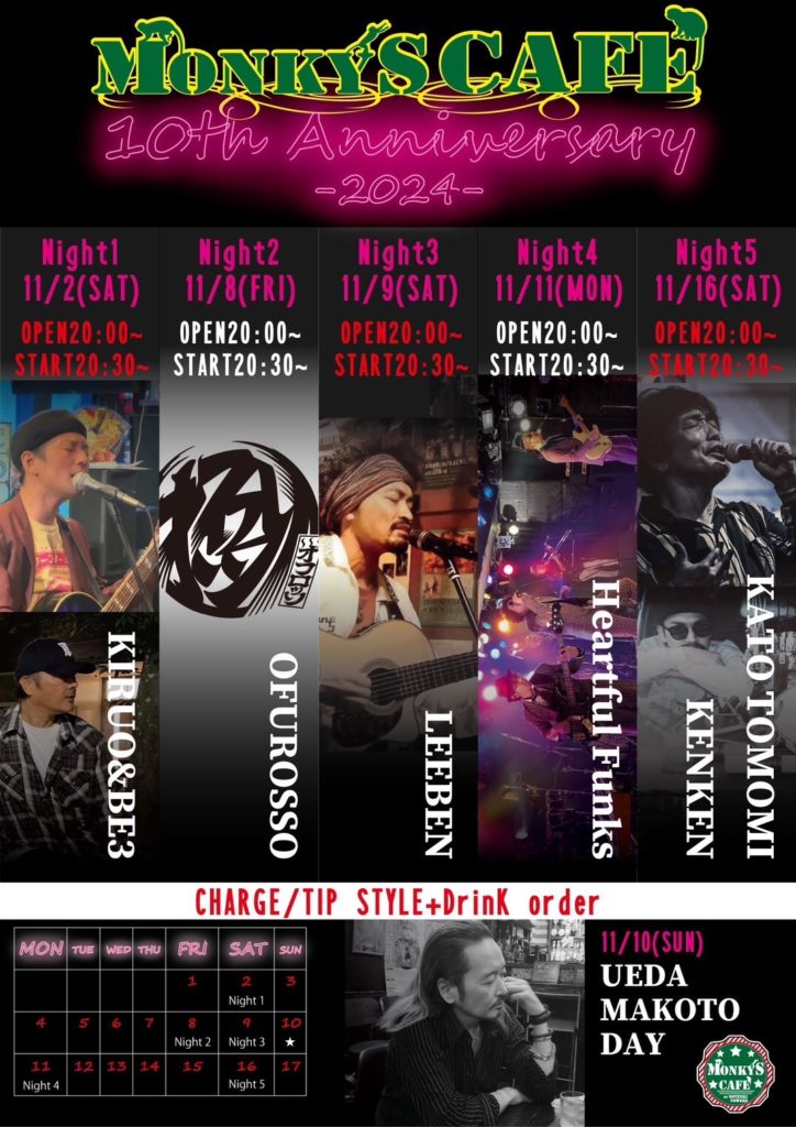 投稿日 2026.01.07 (Wed)2024.11.11(mon)『MONKY’S CAFE 10th Anniversary Live』 @西田辺MONKY’S CAFE OPEN 20:00 START 20:30 ◆2ステージ、投げ銭制 大阪市阿倍野区西田辺町1-1-24 2F